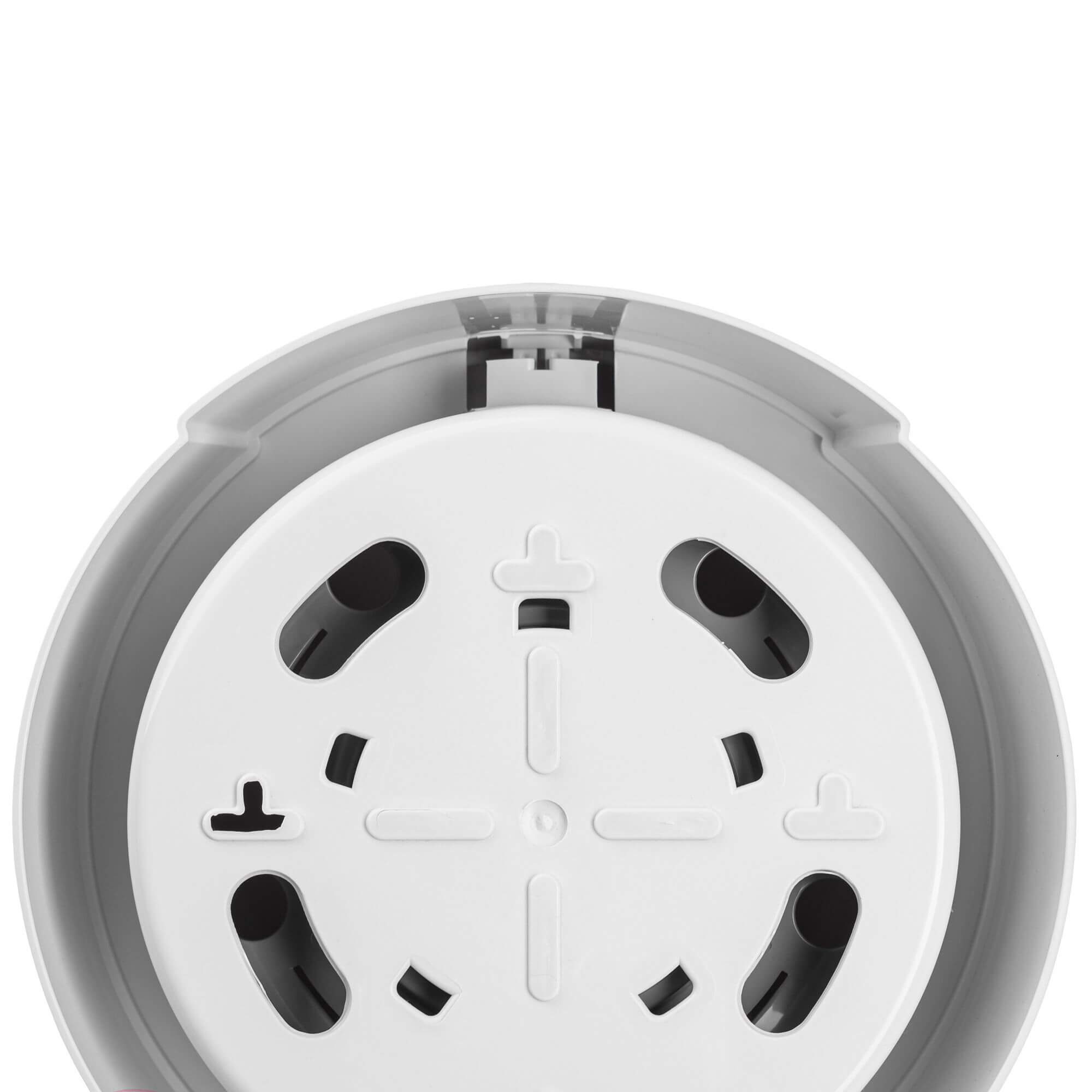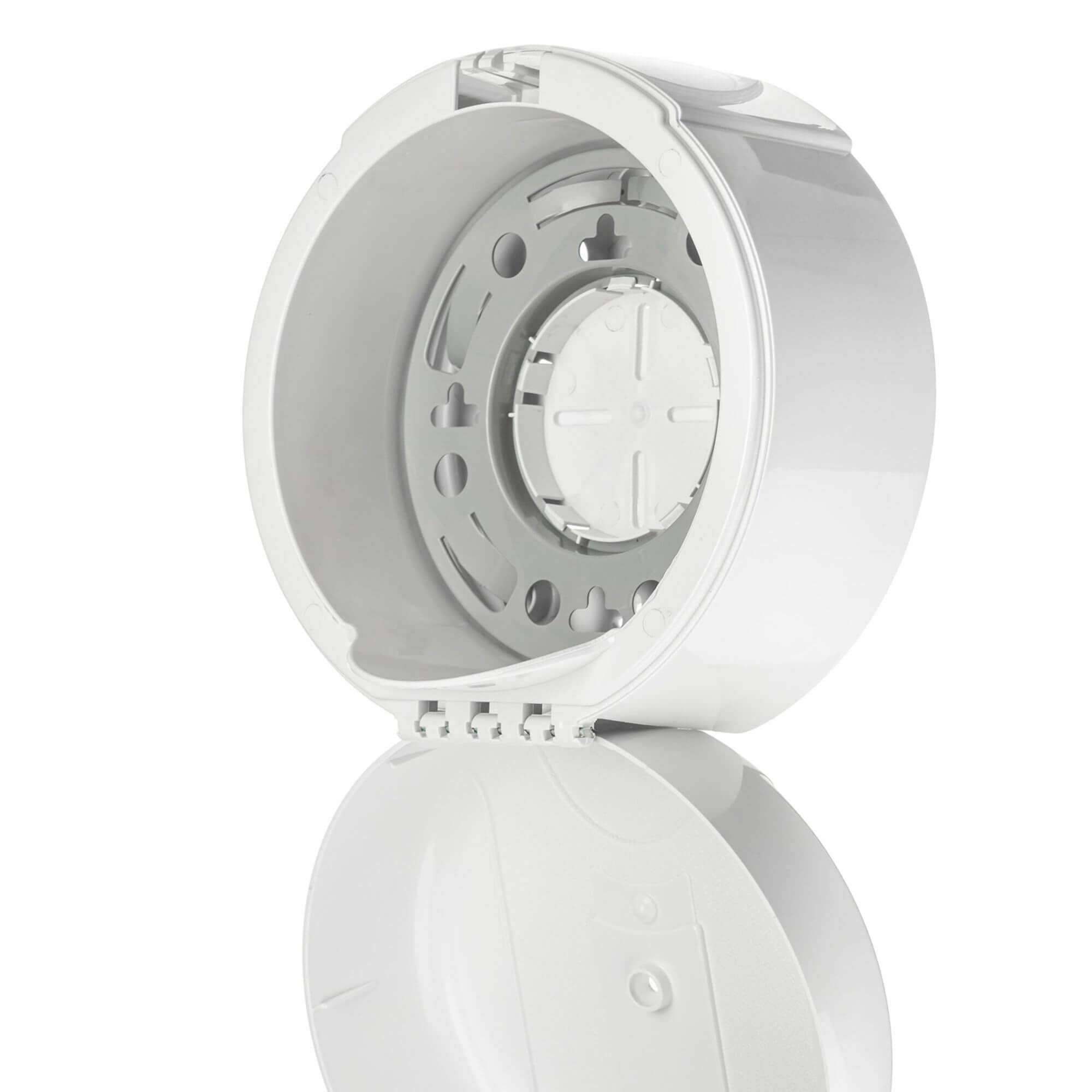 Dozownik do papieru toaletowego z możliwością centralnego dozowania. Podajnik jest wykonany z tworzywa sztucznego ABS w kolorze białym.