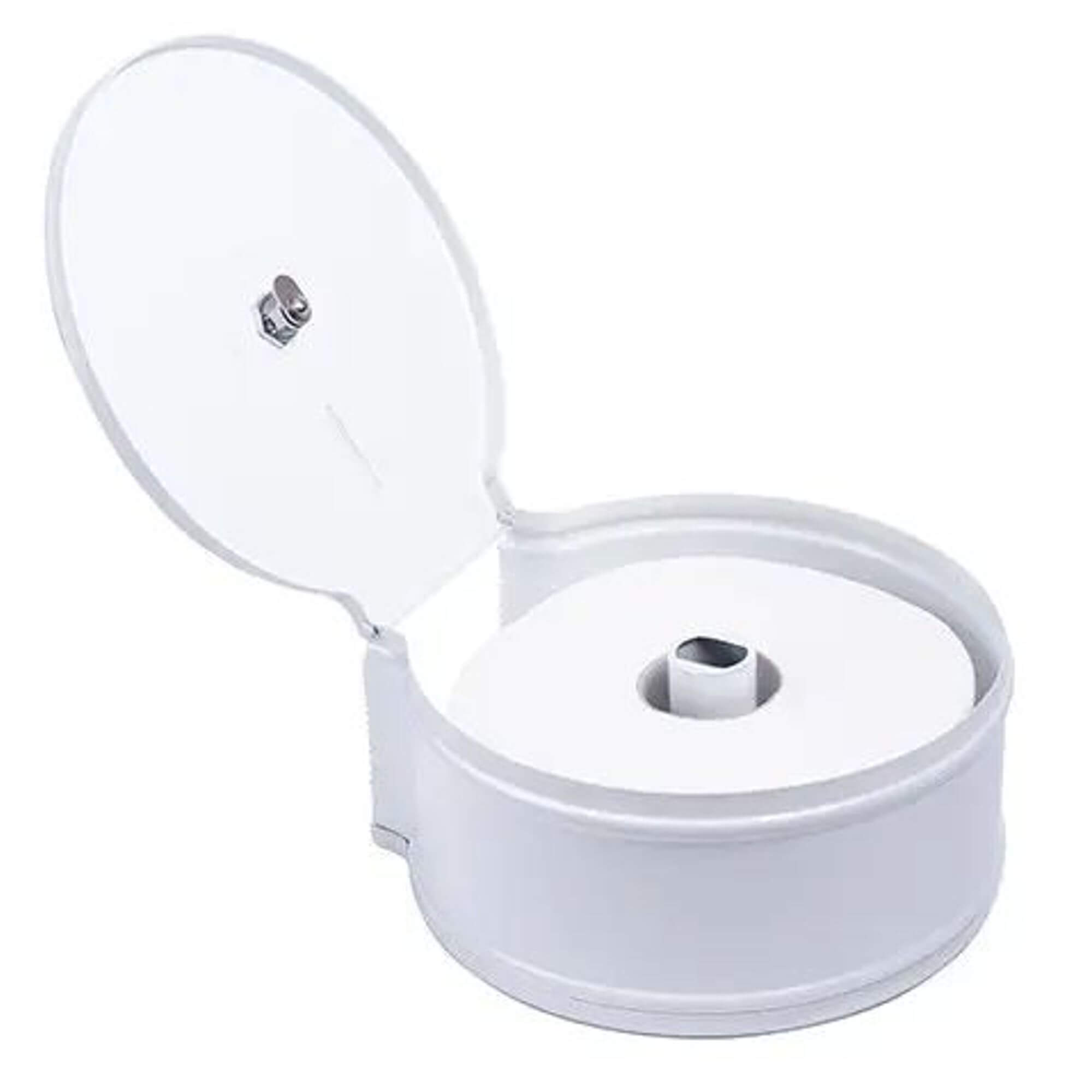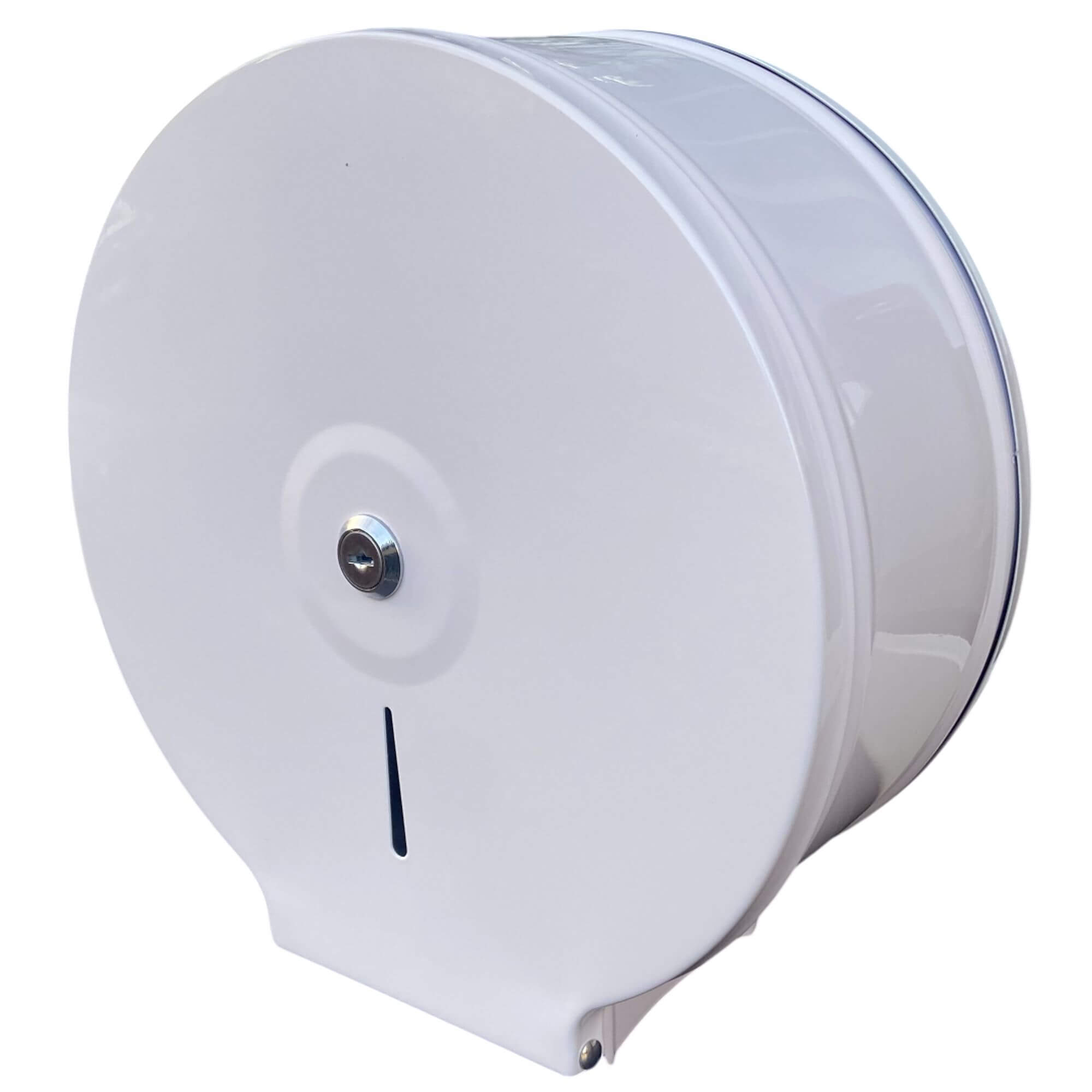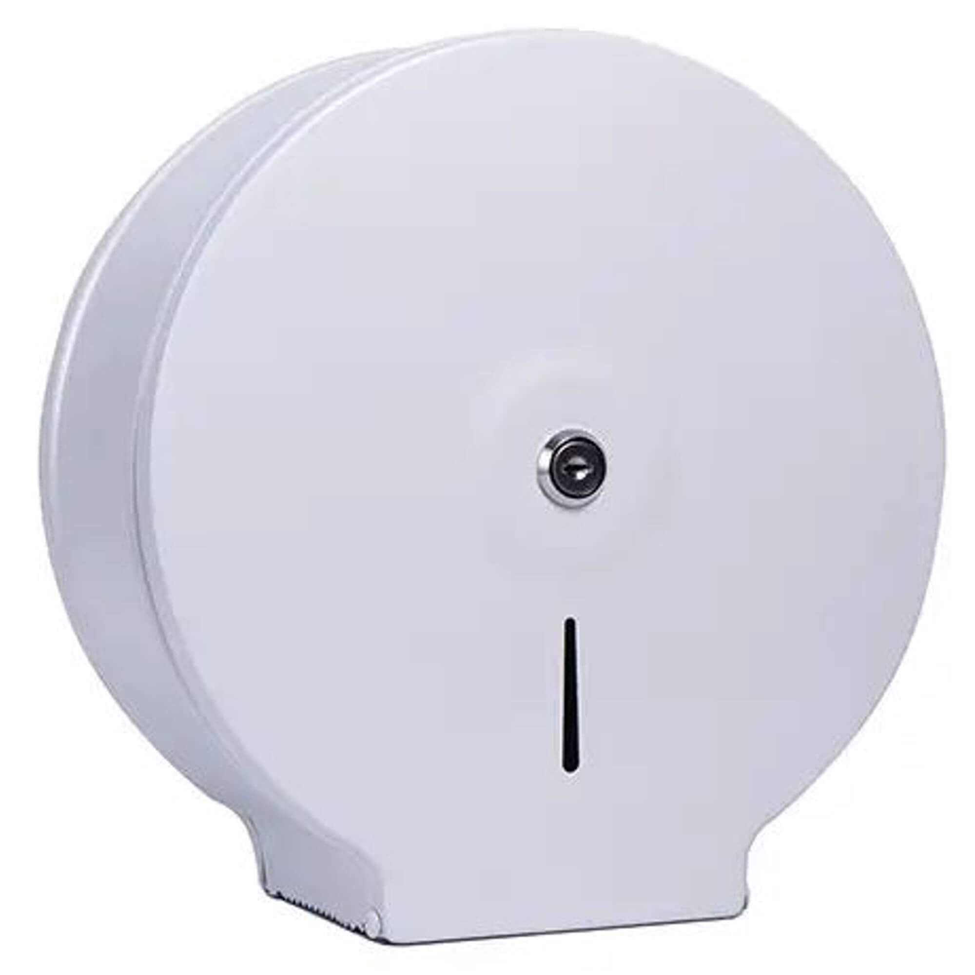 Nowoczesny wysokiej jakości stalowy w dozownik do papieru toaletowego. Podajnik w białym kolorze. Papier toaletowy dozujemy z dolnego otworu. Pojemnik wykonany z stali malowanej oraz dodatkowo lakierowanej. Posiada okienko do kontroli ilości ręczników w pojemniku Zamykany na kluczyk.