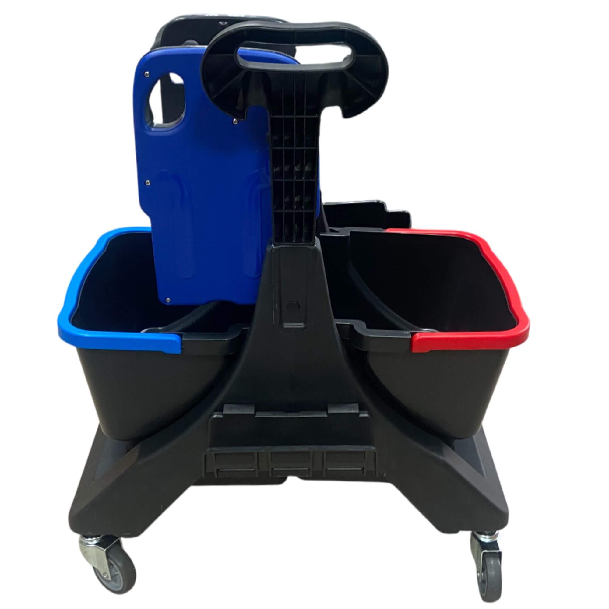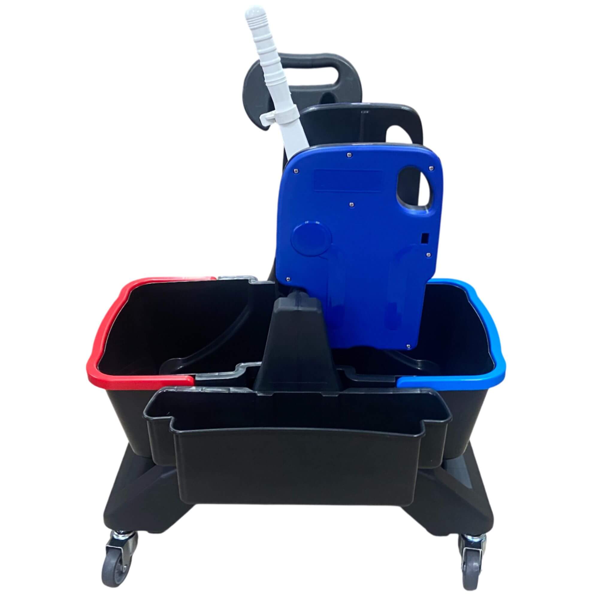 Solidny wózek sprzątający o profesjonalnym zastosowaniu, wykonany z trwałego stelaża z tworzywa pochodzącego z recyklingu. Wyposażony w wytrzymałą wyciskarkę szczękową Extra Jumbo wykonaną z materiałów wysokiej jakości. Posiada dwa oddzielne wiadra na wodę czystą i zużytą, oznaczone niebieskim i czerwonym uchwytem, a także uchwyt na kij od mopa zintegrowany z rączką, podstawę pod mop oraz praktyczny koszyk na akcesoria.