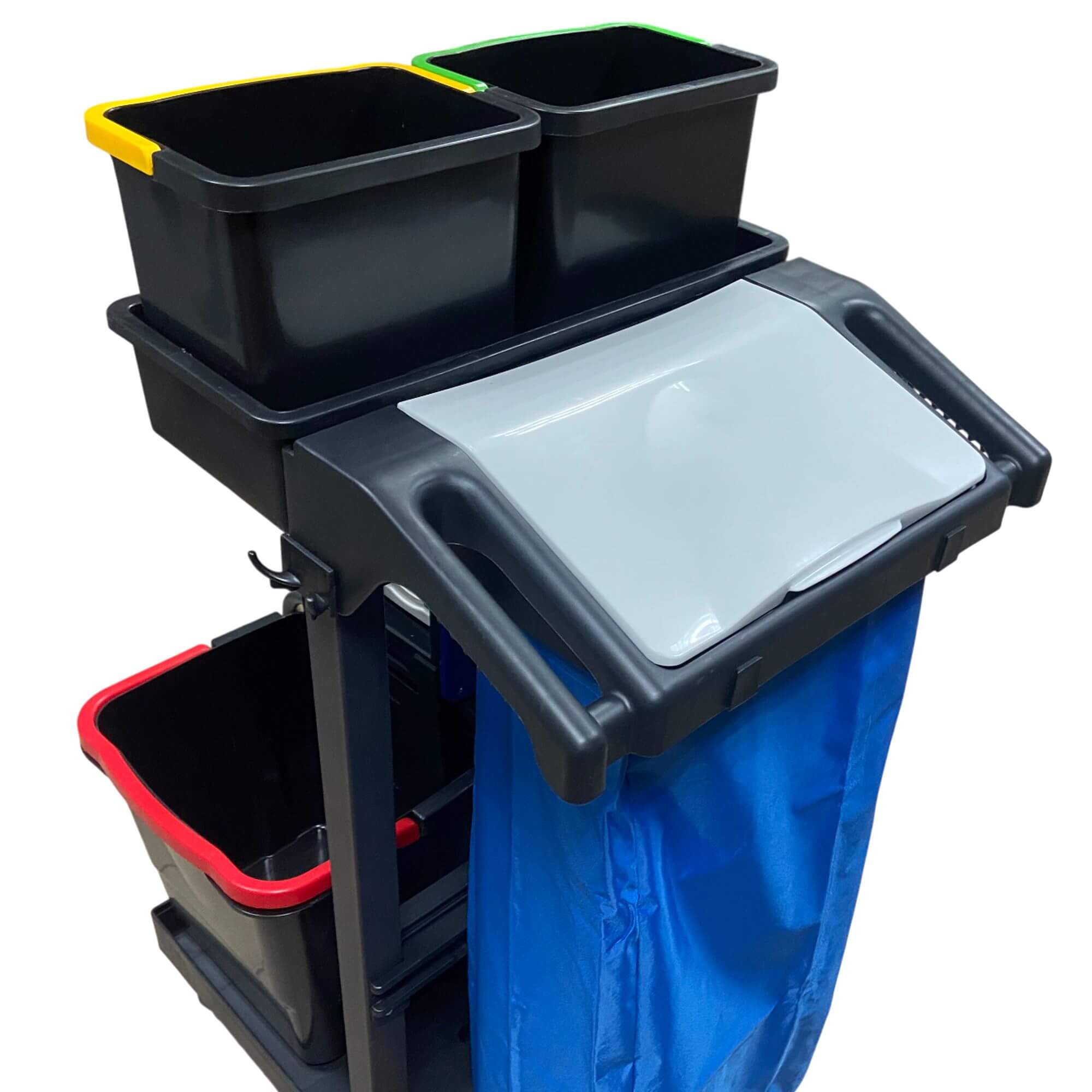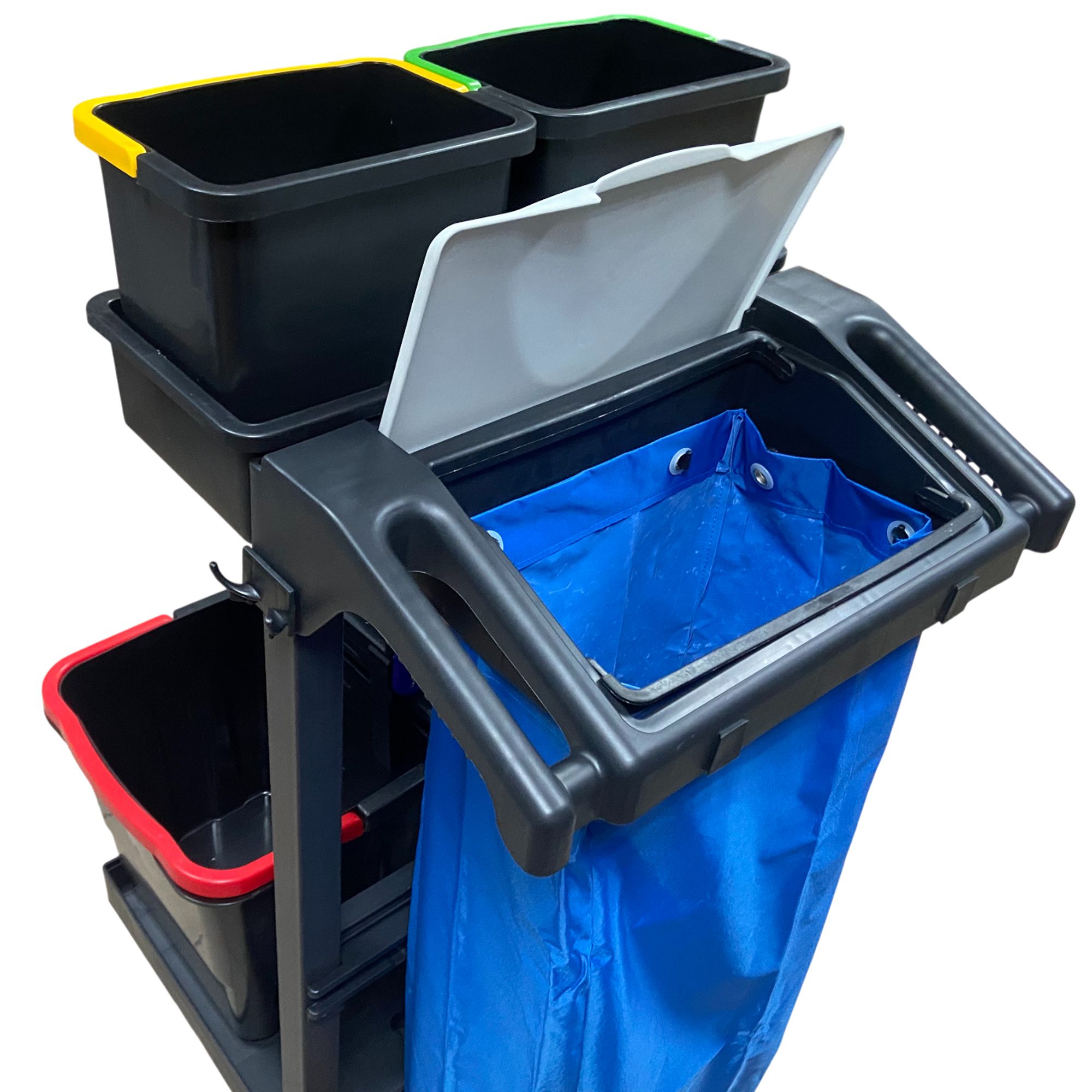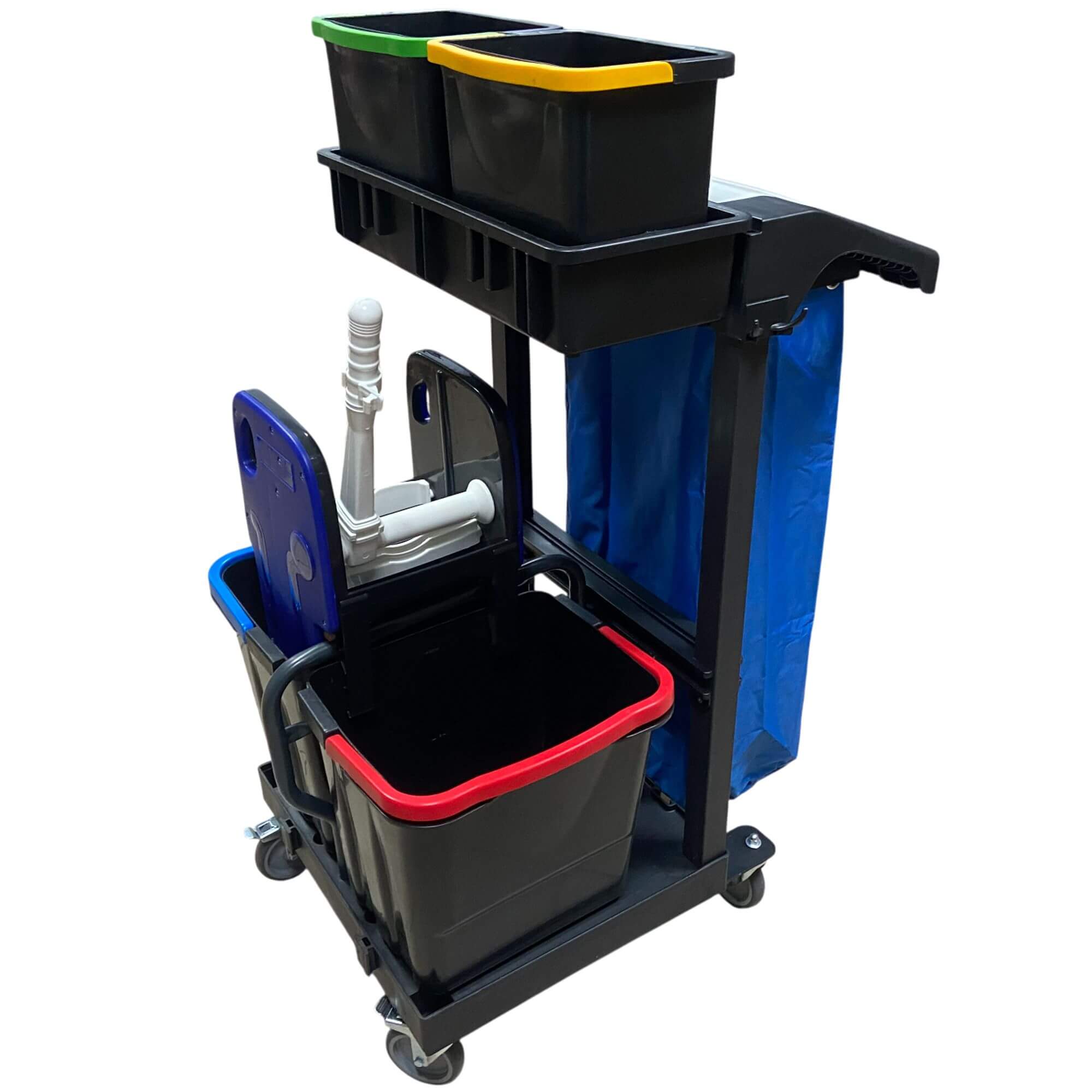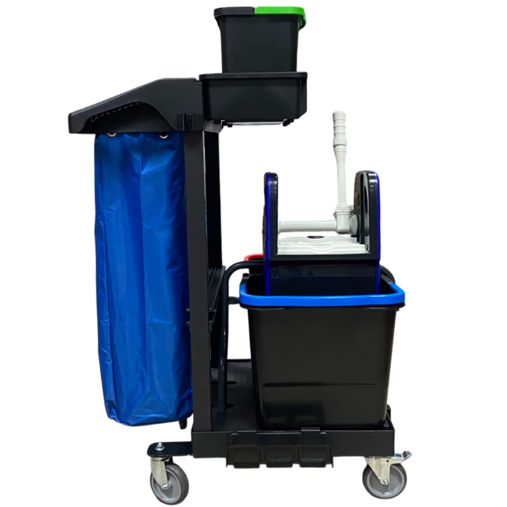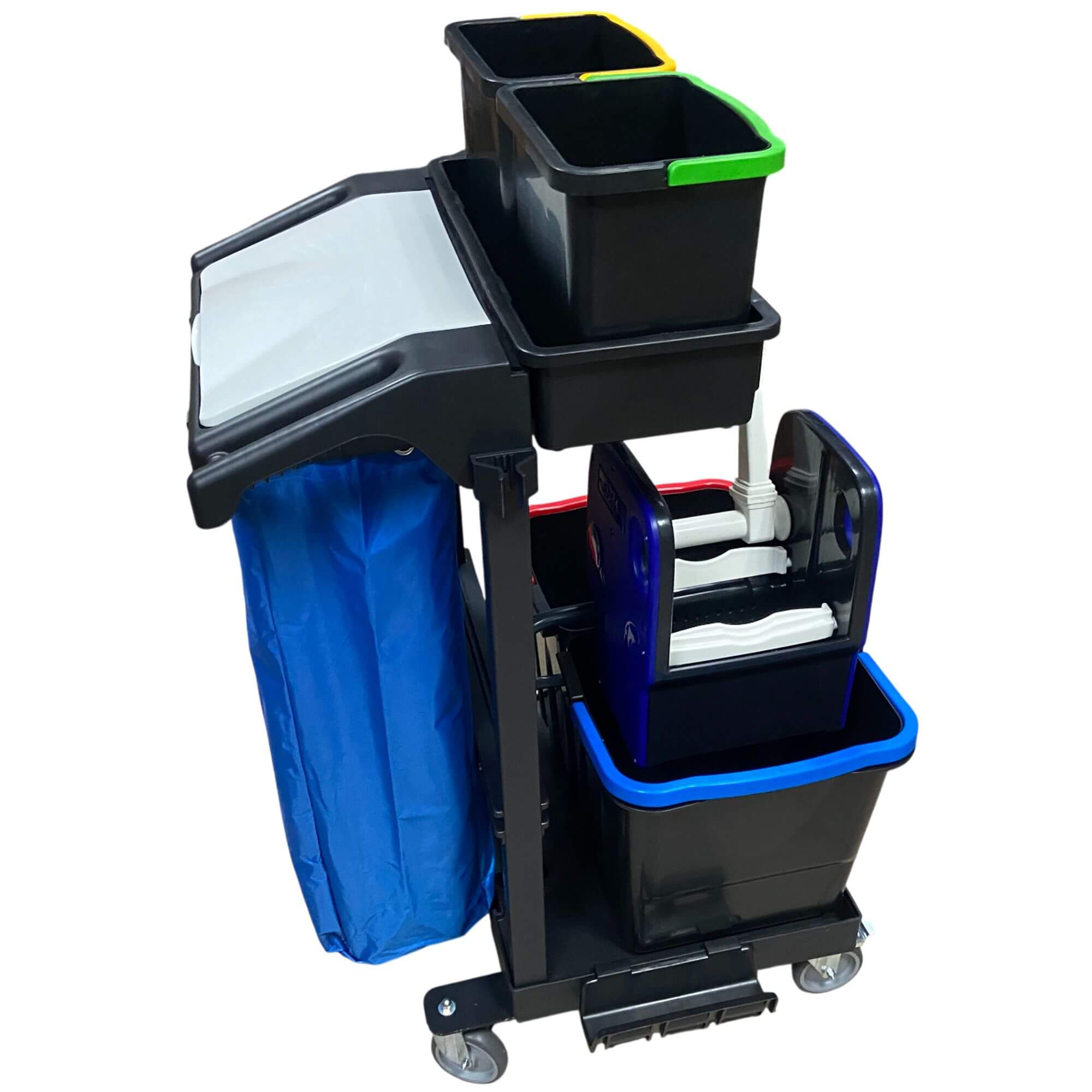 Jest to wielofunkcyjny profesjonalny wózek który ułatwia ekipie sprzątającej zbierania odpadów, zmywania podłóg i czyszczenia powierzchni.