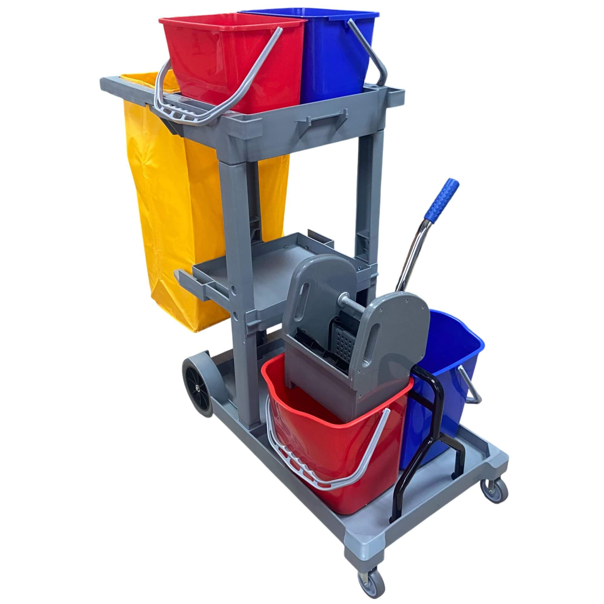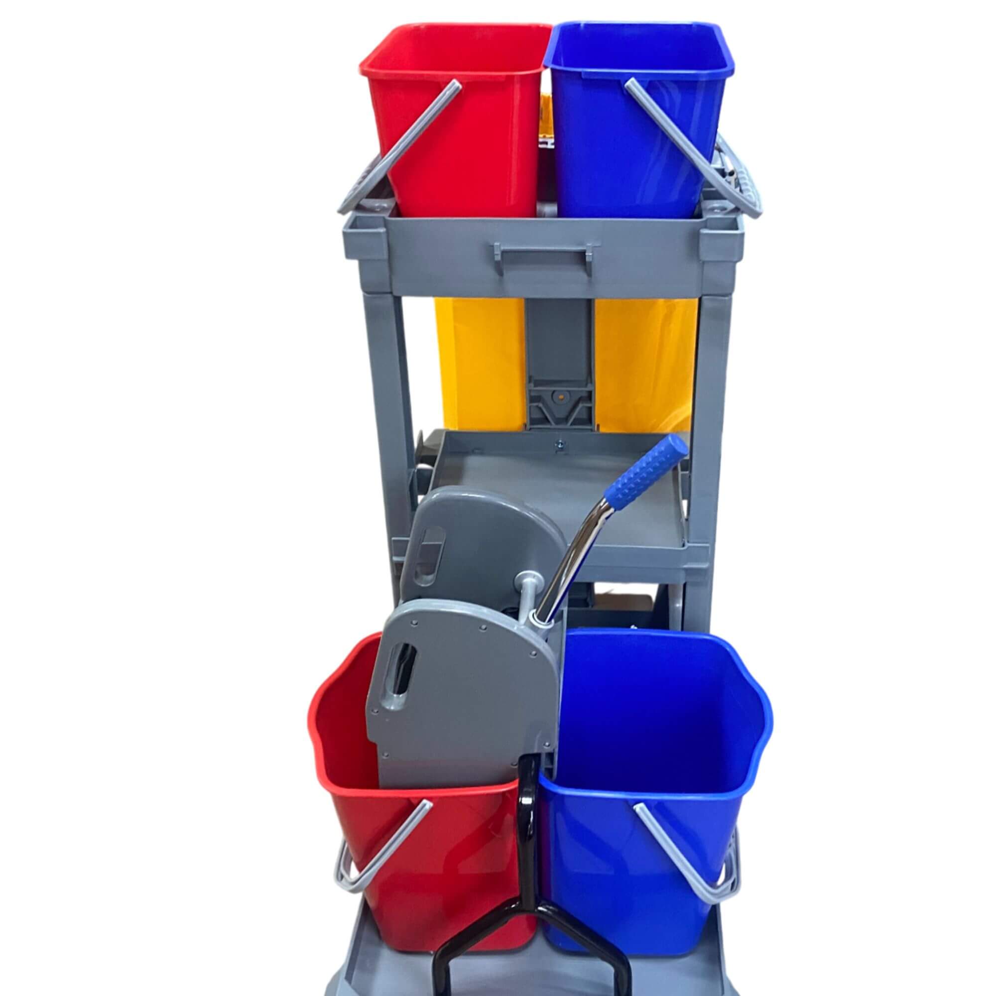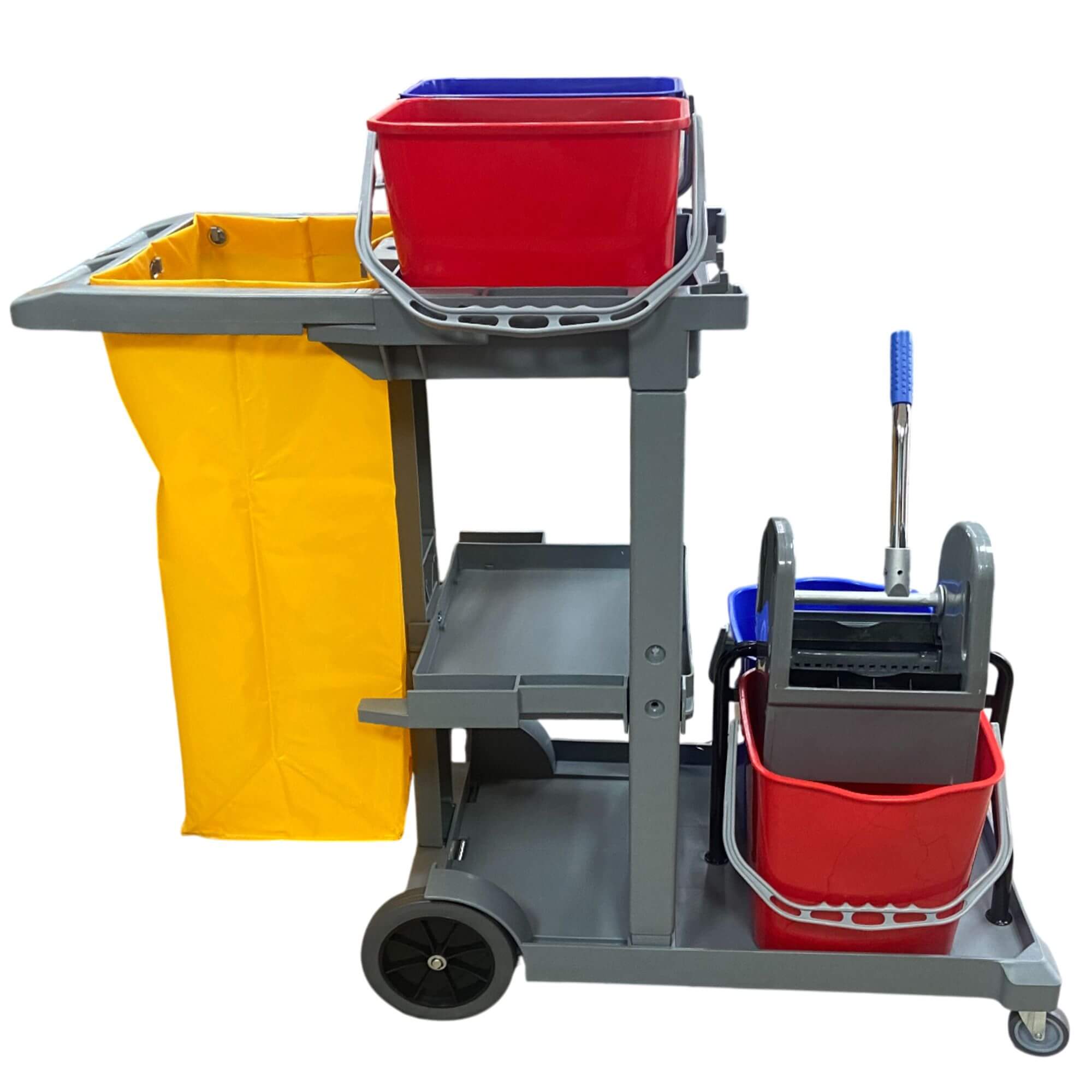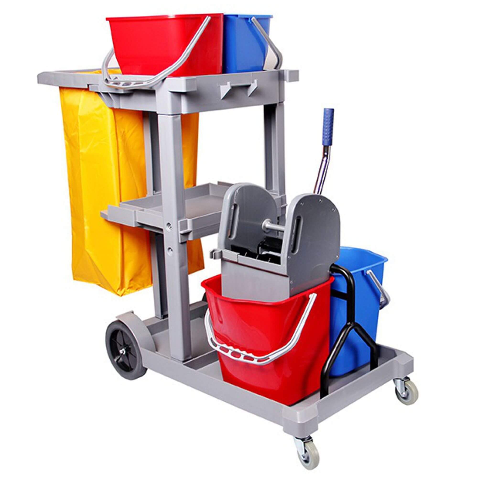 Wielofunkcyjny wózek serwisowy, jest to profesjonalne narzędzie ułatwiające kompleksowe sprzątanie w dużych obiektach, takich jak hotele, biura, szkoły czy szpitale. Wyposażony w 2 duże wiadra o pojemności 20 litrów oraz 2 mniejsze wiadra o pojemności 10 litrów, zapewnia wygodę pracy i efektywne zarządzanie wodą czystą i brudną. Dzięki wytrzymałej wyciskarce, uchwytowi na worek na odpady oraz praktycznej półce na akcesoria, organizacja sprzątania będzie już banalnie prosta.